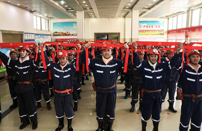 “安全生產月”中,桃園礦為每名礦工贈送了意寓著安全生產的紅腰帶,激發大家堅定安全“四零”目標。(陳敏奎 攝)