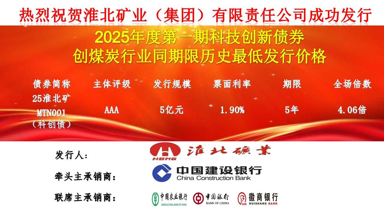 2025年7月8日,淮北礦業集團在銀行間市場成功發行2025年第一期科技創新債券——25淮北礦MTN001(科創債),發行規模5億元,期限5年,票面利率1.90%,全場認購倍數4.06倍,創煤炭行業同期限債券價格最低、集團債券票面利率新低,充分顯示資本市場對淮北礦業集團科技創新實力和高質量發展前景的堅定信心。