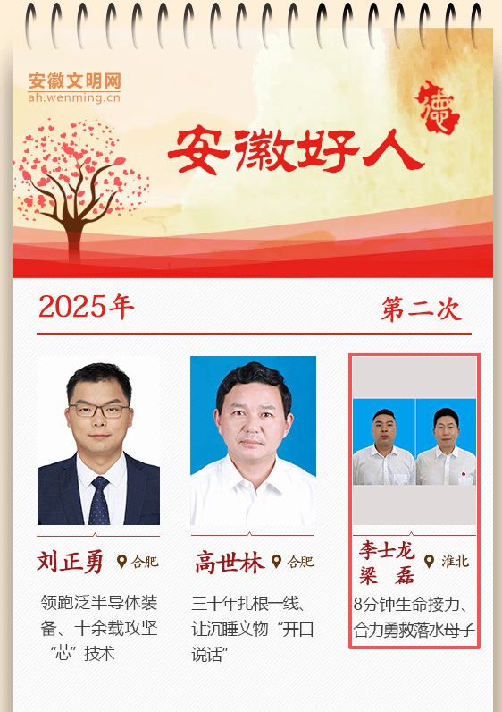 1月4日,安徽省委宣傳部發布了2025年第二次“安徽好人”榜單,青東礦職工李士龍、梁磊榮登榜單,獲評見義勇為類“安徽好人”稱號。