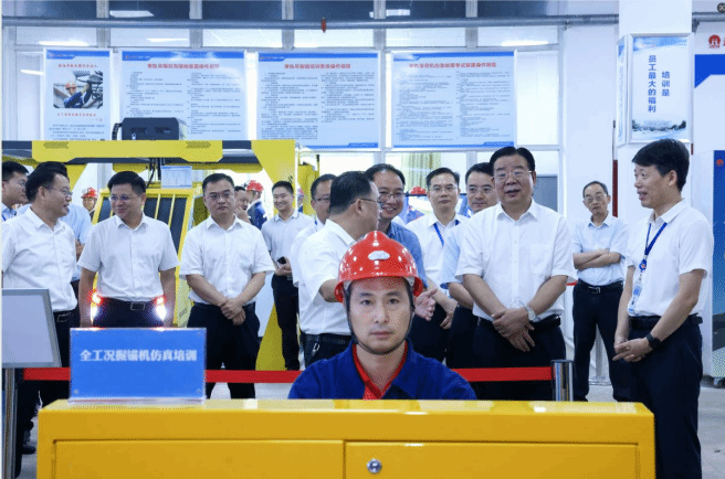 2025年8月“黨管培訓”現場推進會上,集團領導實地觀摩掘錨護一體機仿真培訓設備演示。