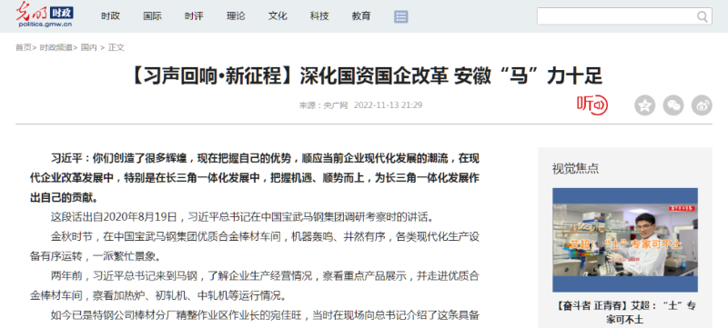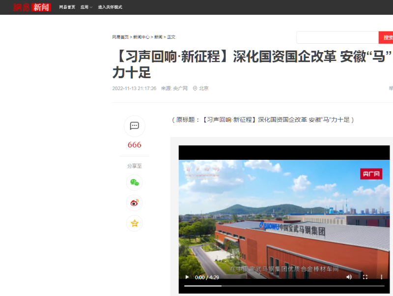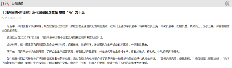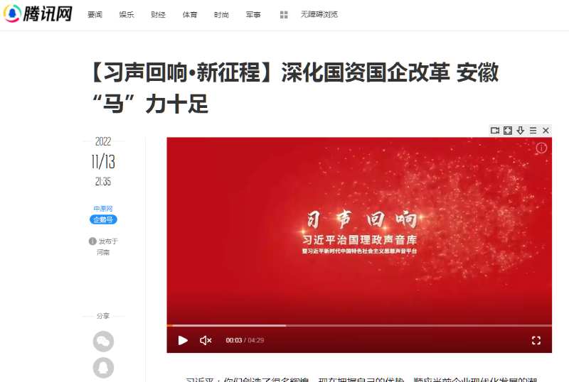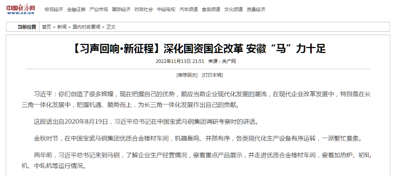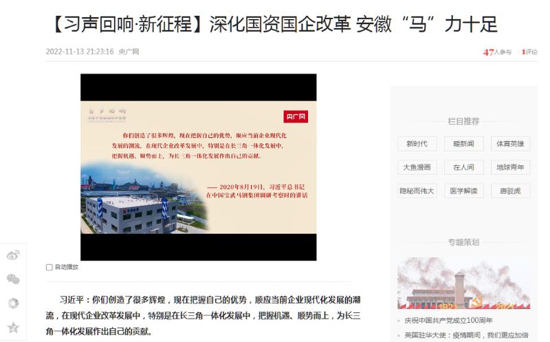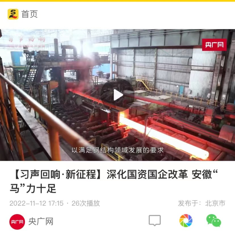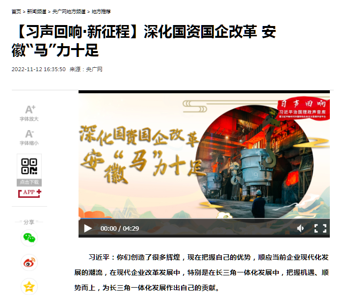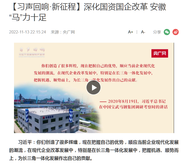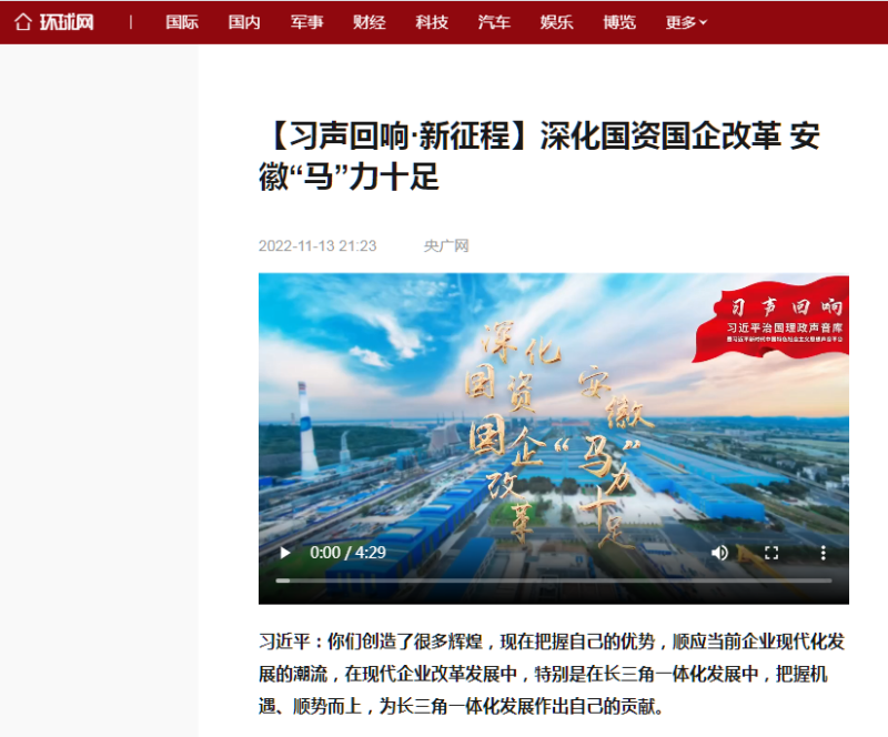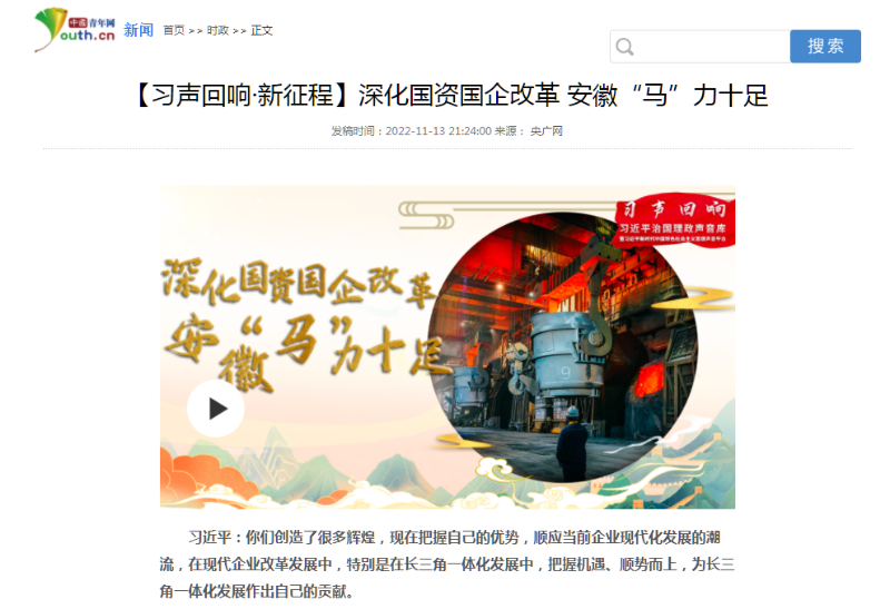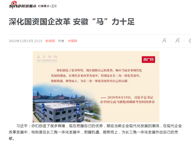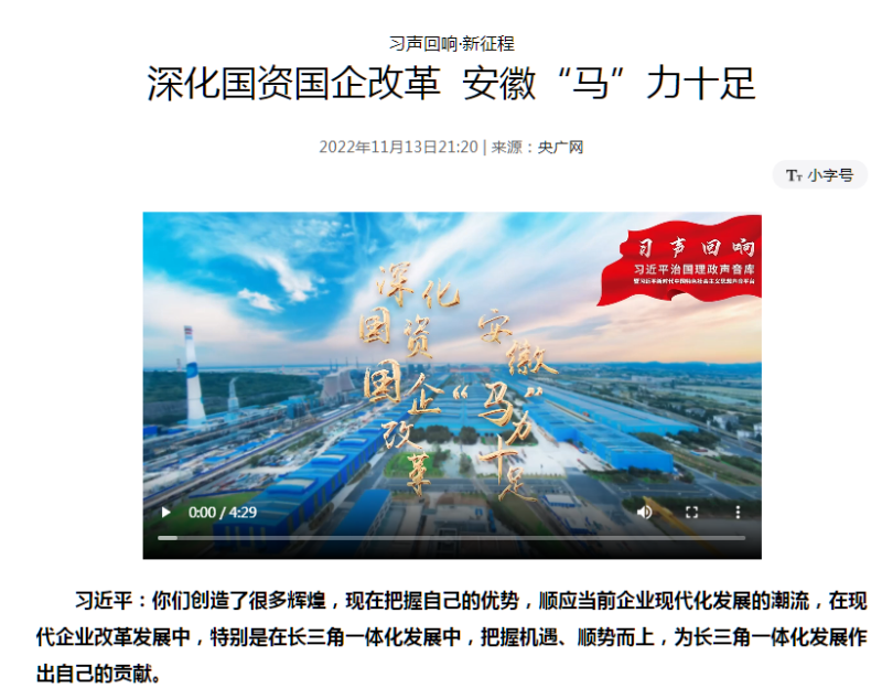 搶抓發(fā)展機(jī)遇,敢為時(shí)代先鋒。國企改革三年行動(dòng)以來,安徽國資國企深化改革創(chuàng)新,不斷轉(zhuǎn)型突破,推動(dòng)省屬企業(yè)高質(zhì)量發(fā)展邁上新臺階。2021年,安徽省屬國有企業(yè)經(jīng)營業(yè)績創(chuàng)歷史最好水平。今年上半年,省屬企業(yè)資產(chǎn)總額首次突破2萬億元。目前,安徽省國企改革三年行動(dòng)的129項(xiàng)重點(diǎn)任務(wù)已基本完成。央廣網(wǎng)、人民網(wǎng)、中國網(wǎng)、中華網(wǎng)、光明網(wǎng)、環(huán)球網(wǎng)、中國經(jīng)濟(jì)網(wǎng)、中國青年網(wǎng)、中青在線、新浪網(wǎng)、網(wǎng)易網(wǎng)、騰訊網(wǎng)、搜狐網(wǎng)、鳳凰網(wǎng)等15家全國主流媒體及30余家省級主流媒體對此進(jìn)行了集中報(bào)道。