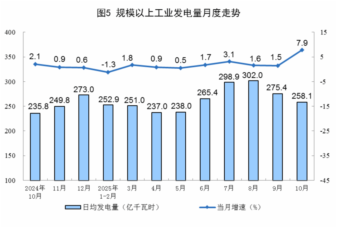 10月份,規(guī)上工業(yè)發(fā)電量8002億千瓦時,同比增長7.9%,增速比9月份加快6.4個百分點;日均發(fā)電258.1億千瓦時。