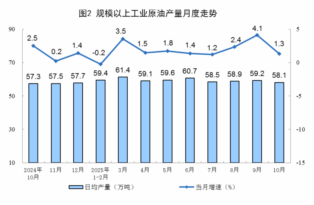 原油生產(chǎn)保持增長。10月份,規(guī)上工業(yè)原油產(chǎn)量1800萬噸,同比增長1.3%,增速比9月份放緩2.8個百分點;日均產(chǎn)量58.1萬噸。1—10月份,規(guī)上工業(yè)原油產(chǎn)量18064萬噸,同比增長1.7%。原油加工平穩(wěn)增長。10月份,規(guī)上工業(yè)原油加工量6343萬噸,同比增長6.4%;日均加工204.6萬噸。1—10月份,規(guī)上工業(yè)原油加工量61424萬噸,同比增長4.0%。